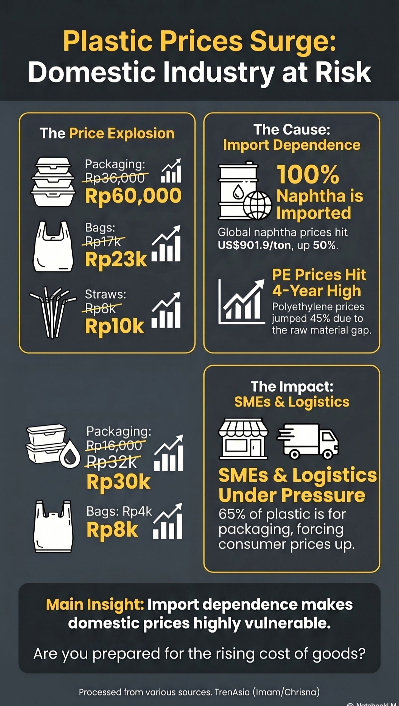 - Harga plastik melonjak tajam akibat krisis nafta global. Ketergantungan impor membuat industri dan UMKM Indonesia tertekan. Apa yang harus dilakukan?