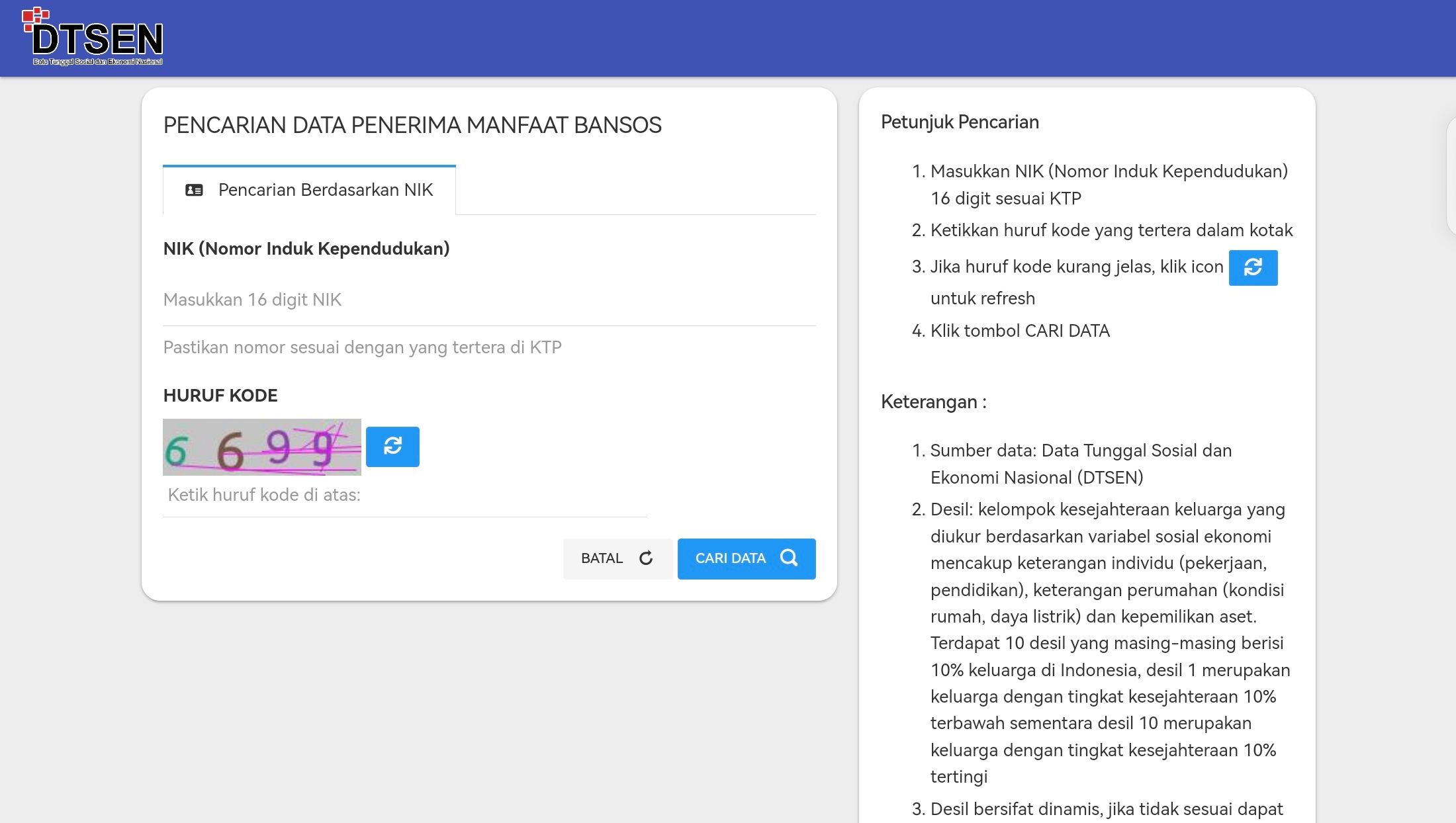 Kunjungi laman resmi Kementerian Sosial di cekbansos.kemensos.go.id lalu masukkan Nomor Induk Kependudukan (NIK) untuk melihat status bantuan.